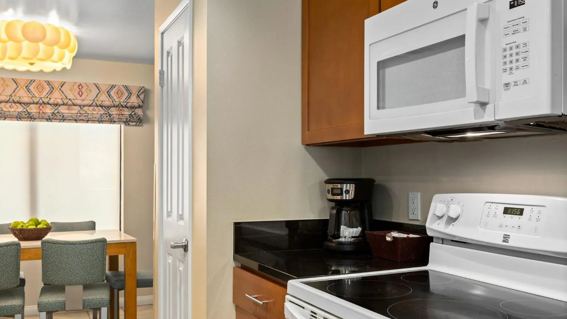 One may find an oven, a stovetop, and kitchenware in the rooms.